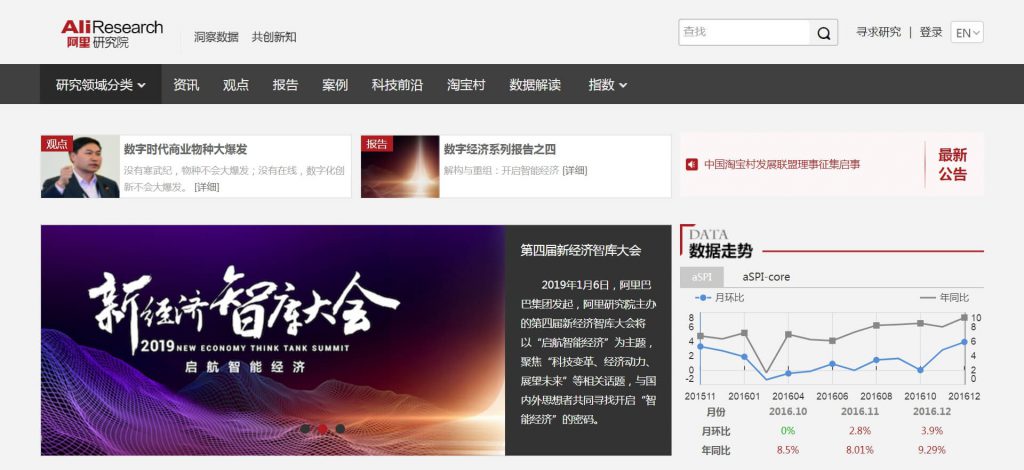 阿里研究院是依托阿里巴巴集团海量数据、深耕小企业前沿案例、集结全球商业智慧,以开放、合作、共建、共创的方式打造具影响力的新商业知识平台。阿里研究,洞察数据,共创新知。与业界顶尖学者、机构紧密合作,聚焦电子商务生态、产业升级、宏观经济等研究领域,共同推出aSPI-core、aSPI、aEDI、aCCI、aBAI及数据地图等多个创新性数据产品、大量优秀信息经济领域研究报告,以及数千个经典小企业案例。