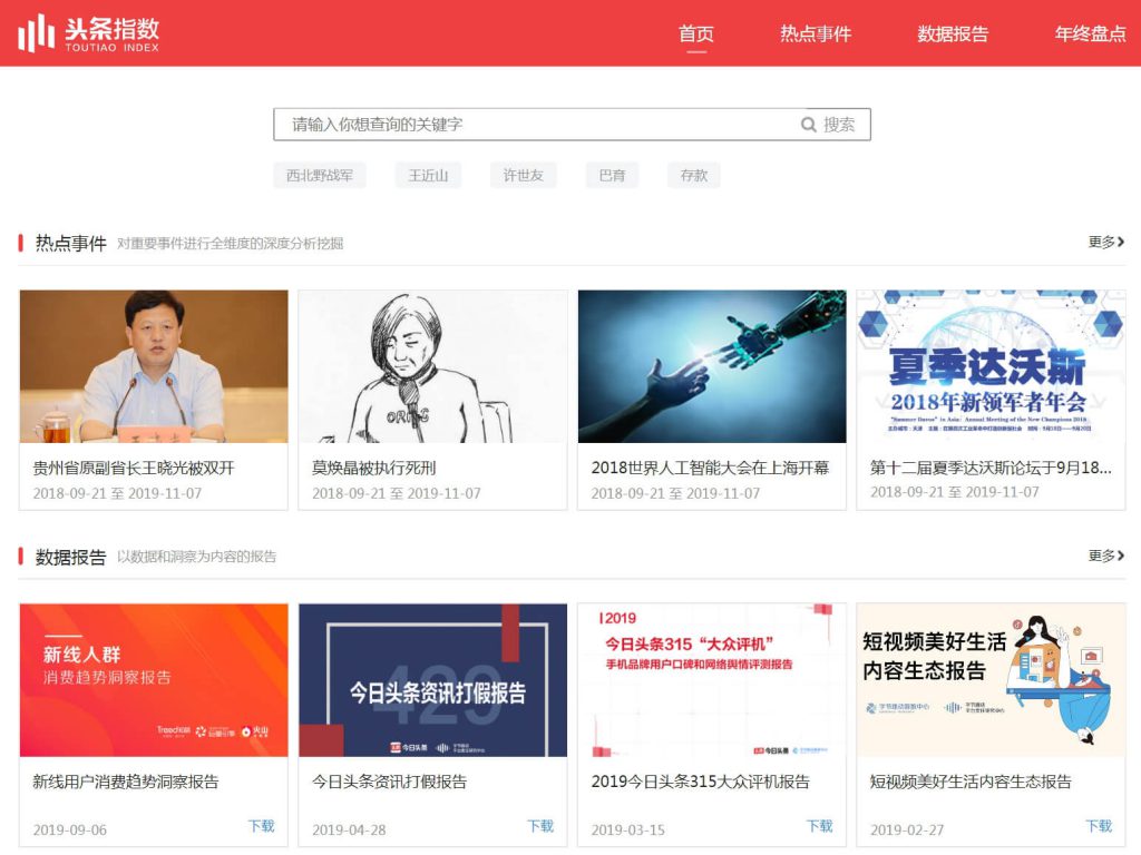 头条指数是今日头条推出的一款数据公共服务产品。不同于微信指数、百度指数和微指数等指数产品,头条指数基于今日头条智能分发和机器推荐所产生的海量内容数据,在内容创作、舆情监控、精准营销等应用场景下,为用户提供关键词的挖掘、热点事件分析和行业报告下载等服务。